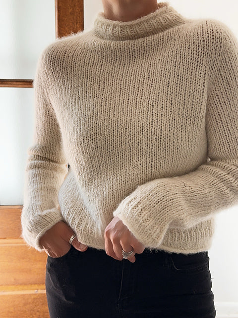 A timeless pullover blending saddle-shoulder and raglan construction for a balanced and clean silhouette. Slightly cropped with a simple mock neck, this design offers an elegant drape and subtle structure—ideal for understated seasonal layering.