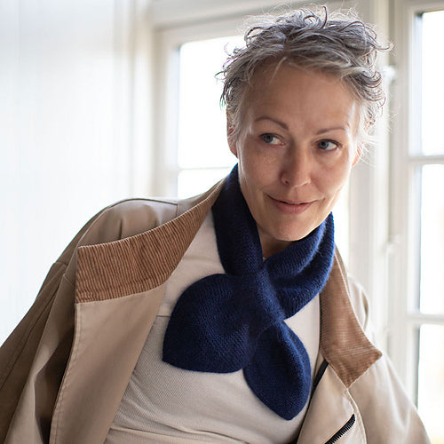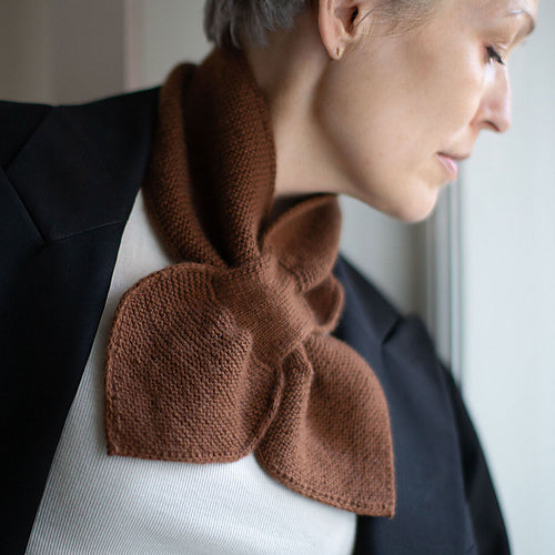 A soft, sculptural bow-scarf inspired by nostalgic styles from the ’70s and ’80s, offering a compact yet elegant silhouette. Its refined shape and subtle volume allow it to be tied or draped in multiple styles, making it a versatile accessory that elevates both casual and refined outfits. The clean lines and gentle form invite customization in yarn and color for personalized character.
