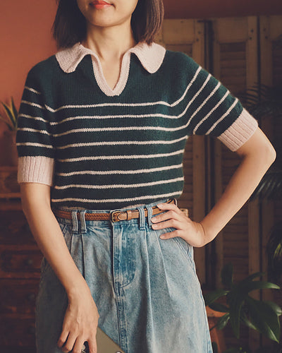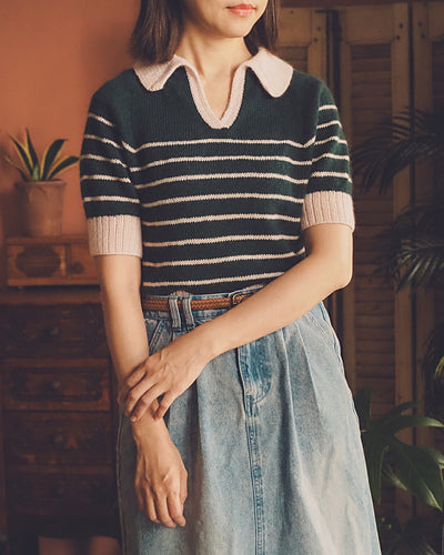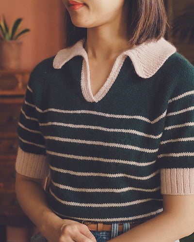 A striking sweater that begins at a narrow collar edge and flows into the body in one seamless movement, this design features a bold contrasting front band that draws the eye with subtle intarsia detailing. With its sculptural V-neck and clean silhouette, it offers a contemporary twist on a classic pullover. The Carol Sweater brings drama and finesse to everyday knitwear while maintaining wearable comfort and elegant drape.